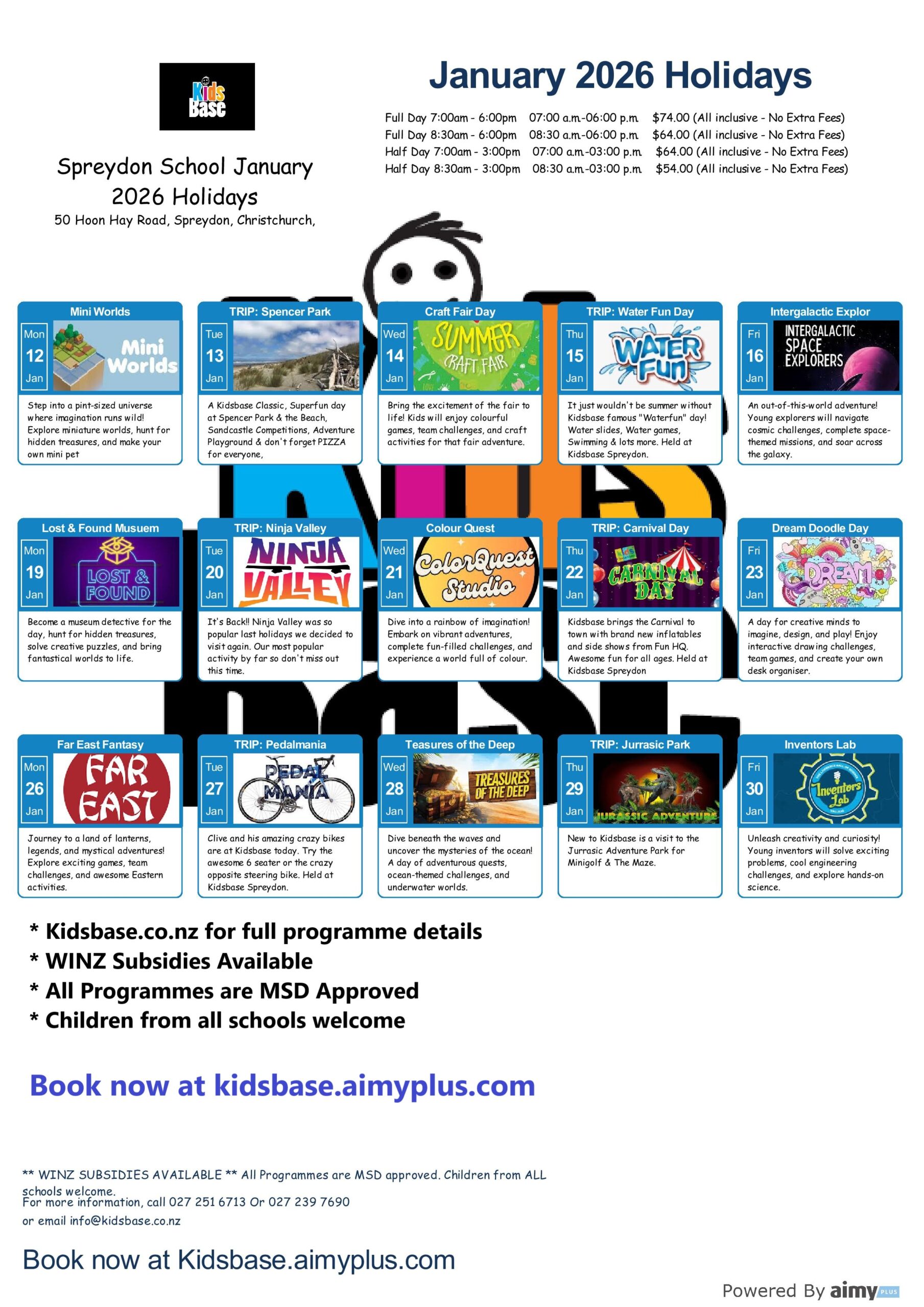 All programmes will be run from the Spreydon School Hall allowing Kidsbase to offer a wide range of activities in such a comfortable, open and warm all-weather space.