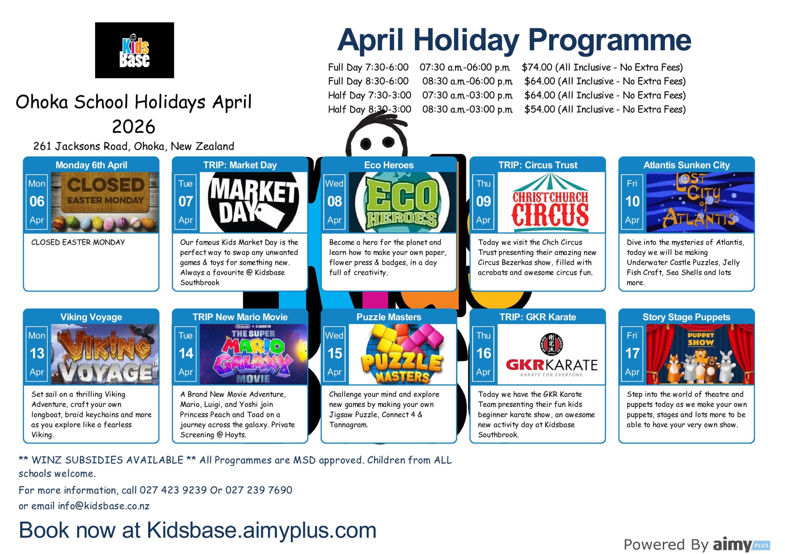 School Holidays: 7:30am – 6:00pm (weekdays during school holidays) Operated from Ohoka School